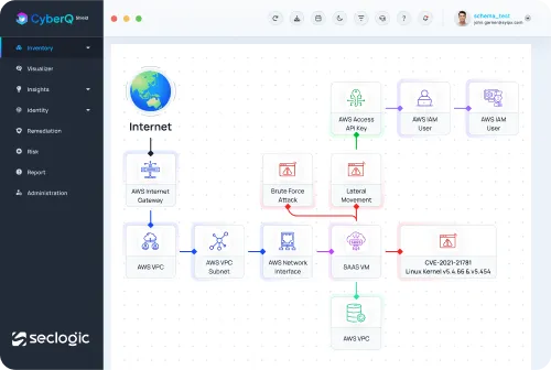 CyberQ Shield analyzes cloud system entitlements and permissions to help teams understand identity-related risks. Scans detect exposed secrets and lateral paths that could compromise sensitive assets, followed by automated remedial suggestions and policies prioritizing least privilege.